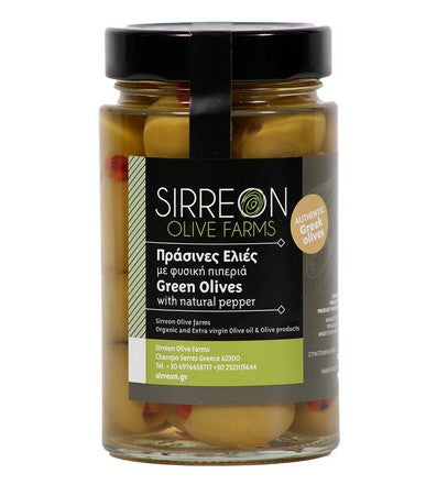 Erlebe die aromatische Kombination aus griechischen grünen Oliven und einer milden Füllung aus fein geschnittenen Paprika-Stücken. Die Oliven stammen von Sirreon Olive Farms, der traditionellen Olivenfarm der Familie Grigoriadis in Haropo (Region Serres, Nordgriechenland).